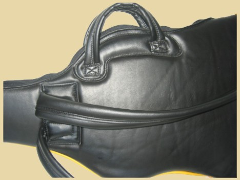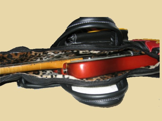 made out of upholstery vinyl, 5/8 inch foam + 1/4 inch foam+ inside leopard fabric, it feels, looks good and it will protect you guitar .